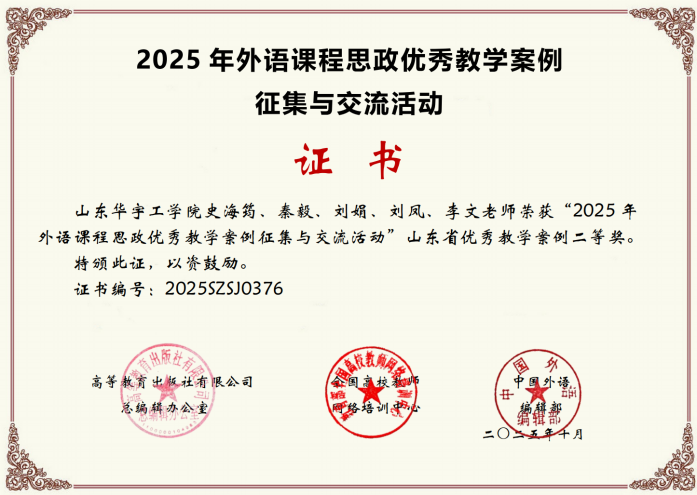 近日,2025年外语课程思政优秀教学案例征集与交流活动获奖名单正式对外公布,我院商务英语教研室教师史海筠、秦毅等教师凭借优秀的课程思政教学案例设计荣获山东省二等奖,展现了我院教师在外语教学与思政教育融合方面的创新成果。另外,商务英语教研室刘娟老师讲授的《综合英语》课程获得第二批全国高校“智慧课程”案例征集评选优秀案例。