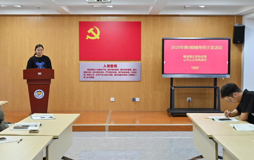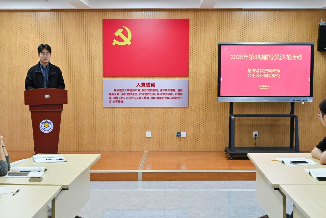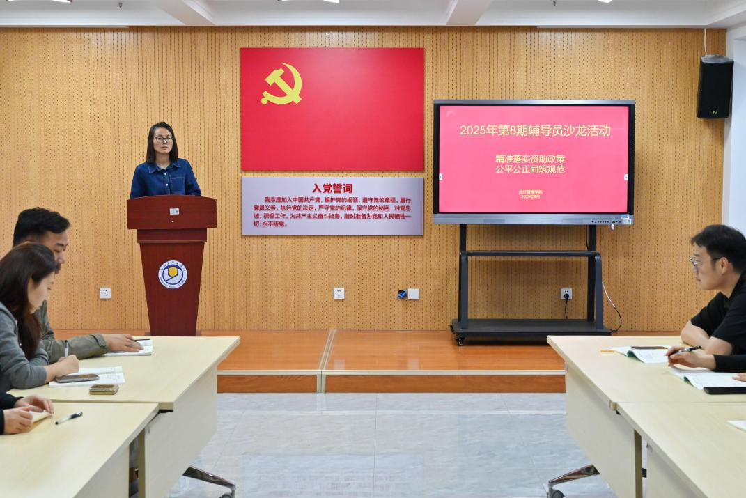为进一步精准落地资助政策,规范资助工作全流程,充分发挥“资助+育人”双重功能,9月29日上午我院21公寓党建活动室举行2025年第8期(总第26期)辅导员沙龙。本次活动以“精准落实资助政策,公平公正同筑规范”为核心主题,聚焦资助政策解读、工作流程梳理、实践经验交流等关键环节,为后续资助工作高效开展奠定基础。学院党总支书记、副院长范世伟,管理科科长张莉超,团总支书记王群及全体辅导员出席了此次活动。
