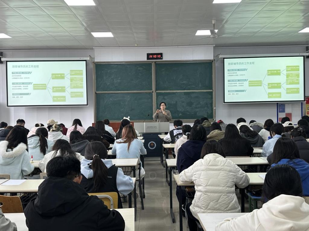 为切实提升班级朋辈辅导员的心理健康服务能力与问题解决能力,筑牢校园心理健康防护网,助力团学干部提升心理素养,增强助人能力,11月6日,我院在力行楼710教室隆重开展朋辈辅导员专题培训。2025级全体心理委员及各班级团支部书记共计115人参加培训,本次培训由心理健康指导老师范秀担任主讲人。